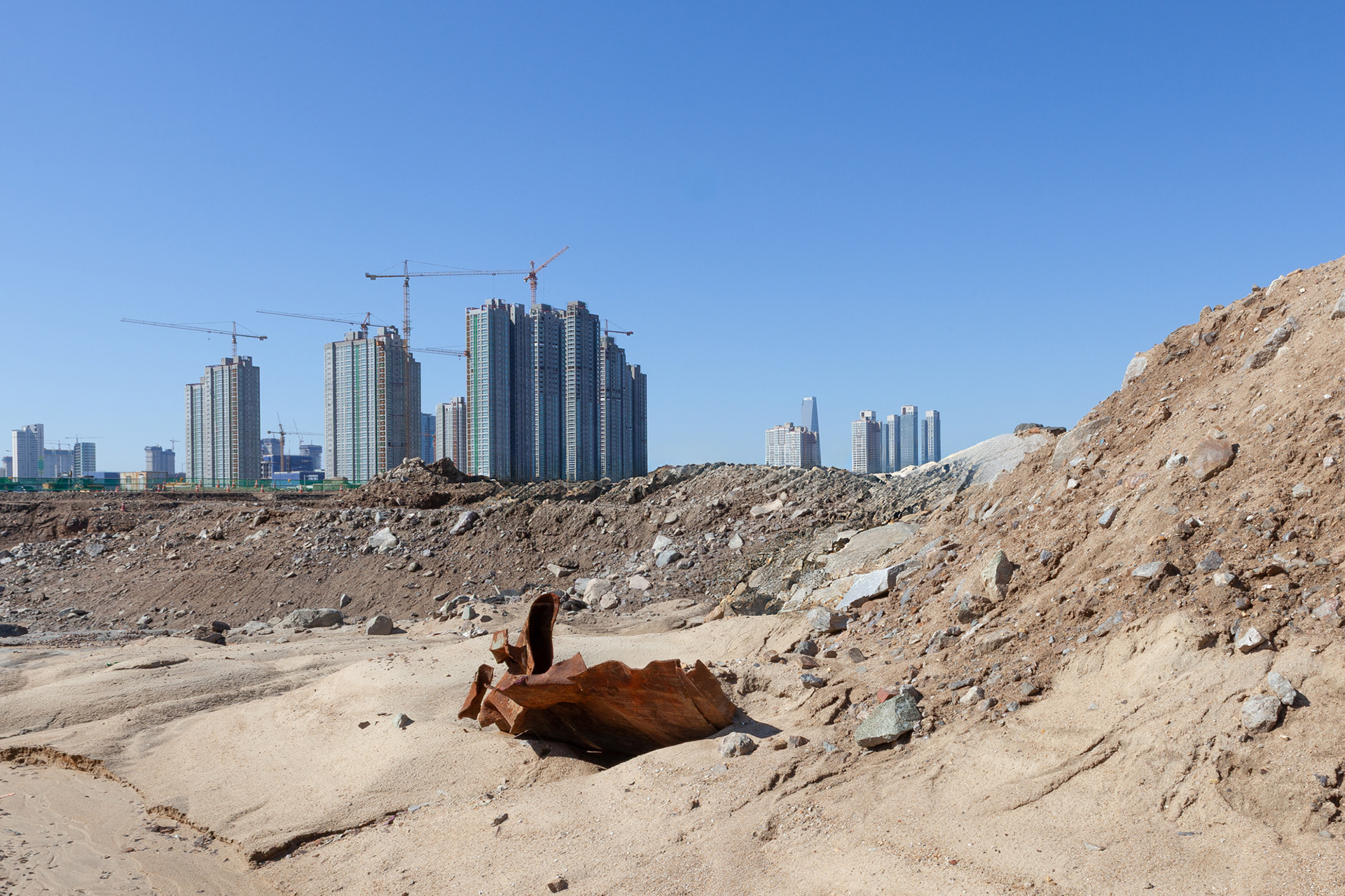 나의 풍경은 인간의 손으로 디자인되고 있는 새로운 풍경의 서사를 기록해 왔다. 인천 영종 신도시 개발 현장, 송도 간척지, 그리고 산허리가 잘려 나간 거대한 채석장들이 바로 그 현장이었다. 산을 깎고 바다를 메워 콘크리트를 채우는 모습, 저 깊은 바닷물 한가운데 있는 커다란 구조물을 위해 물을 퍼내고 철근을 세우는 모습을 통해 풍경을 창조해 내는 인간의 힘을 느꼈다. 멀지 않은 과거에 바다의 한 부분이었던 송도의 풍경은 인간이 바다를 어떻게 리디자인했는지를 보여주고 있는 파괴와 창조의 서사를 담고 있다. 수억 년 동안 바다가 품었던 뻘은 파괴되었고 그 자리엔 인간을 위한 새로운 아스팔트와 콘크리트 구조물이 창조된 것이다.